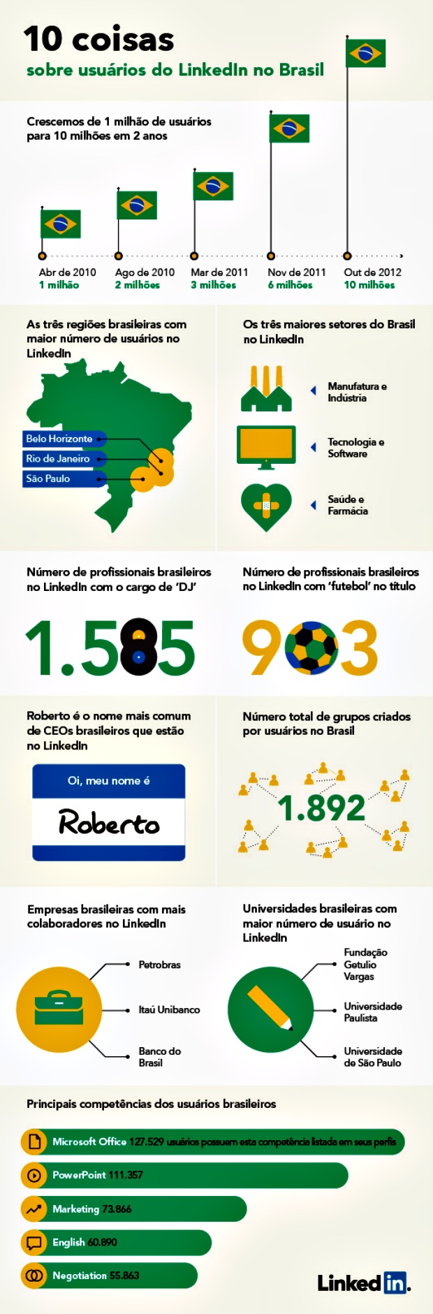 O LinkedIn atingiu a marca dos 10 milhões de usuários no Brasil, afirmou Osvaldo Barbosa de Oliveira, diretor geral da companhia no país, nesta terça-feira. O dado é significativo e coloca o Brasil entre os três principais mercados da rede social profissional em todo o mundo, ao lado de Grã-Bretanha. Os Estados Unidos lideram a lista, seguidos pela Índia.