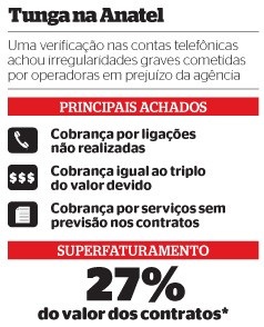 As irregularidades identificadas por Ricarlos são idênticas às encontradas por muitos brasileiros em suas faturas mensais. Ricarlos descobriu três tipos de cobranças indevidas: cobranças que somavam mais do que o preço combinado, cobranças por serviços que nunca existiram e cobranças por serviços não previstos em contrato. Sempre a mais, nunca a menos. Parece familiar? Entre julho de 2010 e junho de 2011, o programa de Ricarlos detectou cobranças indevidas à Anatel no valor de R$ 211 mil – dentro de faturas que alcançaram R$ 771 mil. Juntas, portanto, as operadoras apresentaram valores 27% mais altos do que deveriam nesse intervalo de tempo. Exemplo: em janeiro de 2011, a Claro cobrou R$ 14.229,65 da Anatel pela conta dos celulares, quando deveria ter cobrado apenas R$ 7.479,13. O que mais contribuiu para a diferença foi a assinatura básica. A Claro apresentou fatura de R$ 2.261,88 para esse item. O valor aferido pelo ADT, contudo, foi de R$ 1.552,08. O segundo fator mais importante para a diferença foi o adicional por deslocamento. O valor correto, checado pelo ADT, seria de R$ 289,32. A quantia cobrada pela Claro foi de R$ 572,24. Com base nas informações do ADT, a Anatel pôde glosar quase metade do valor dessa conta. E deixou de pagar os valores indevidos cobrados a mais pela Claro. Em nota a ÉPOCA, a Claro afirmou que a relação da empresa com a Anatel é satisfatória, “tanto que o contrato foi renovado quatro vezes consecutivas”. A Oi afirmou que corrige os valores das contas quando o cliente tem razão. A Embratel informou que não comenta contratos de clientes. Nenhuma empresa respondeu, portanto, sobre os valores cobrados a mais da Anatel.