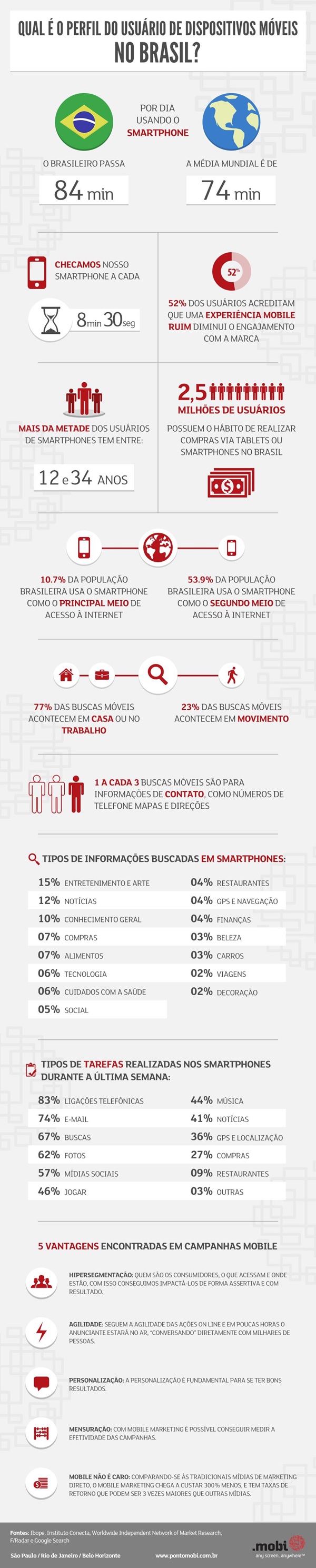 Qual é o perfil do usuário de dispositivos móveis no Brasil? Para finalmente dar uma resposta clara a essa questão, a Pontomobi reuniu dados gerados por diferentes institutos de pesquisa para criar o infográfico abaixo. O resultado reflete a explosão do volume de smartphones no mercado nacional e afeta diretamente a relação do brasileiro com dispositivos móveis. “Mesmo com penetração ainda em crescimento, abaixo dos 30%, o brasileiro já adquire comportamentos muito consistentes, como tempo de uso acima da média mundial e, principalmente, transferindo comportamentos da internet desktop para o novo aparelho. Vale destacar que mais de 2,5 milhões de brasileiros já possuem hábito de realizar compras em dispositivos móveis”, analisa Léo Xavier, CEO da Pontomobi.