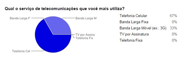 Nossa enquete da semana passada perguntou aos visitantes do nosso site qual dos serviços de telecomunicações oferecidos pelas operadoras brasileiras eles mais utilizam. A maioria (67%) utiliza mais a telefonia celular no dia a dia. Enquanto que a banda larga móvel 3G foi a segunda mais utilizada (33%). Veja no gráfico: