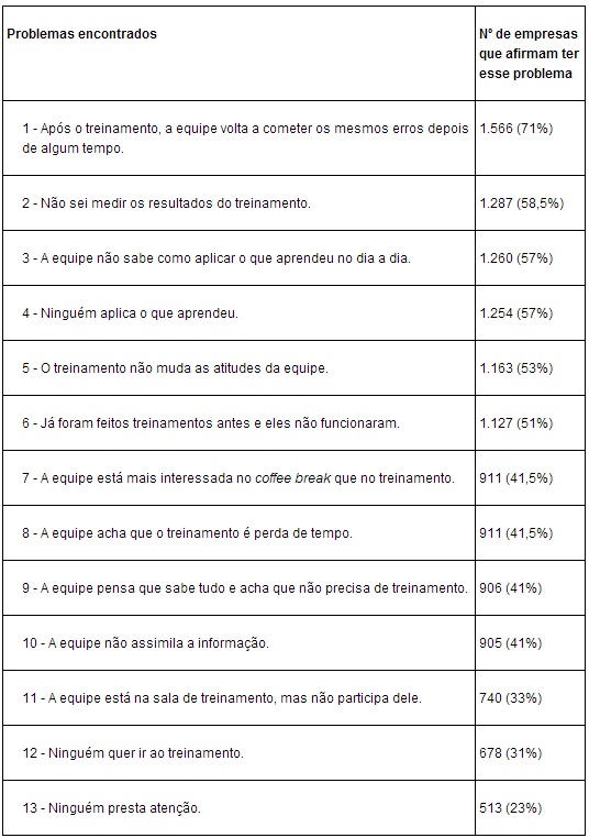 Em 2010, a Editora Quantum fez um levantamento com mais de 2 mil companhias do País para verificar quais são os problemas que tiram o sono de quem decide treinar e identificou 13 fatores problemáticos. É como se fosse um diagnóstico da saúde dos treinamentos nas empresas. Veja quais são os fatores no quadro abaixo: