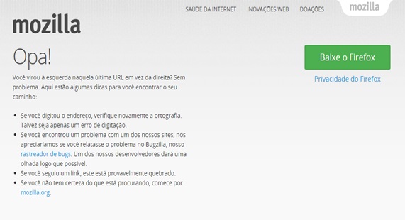 A página 404 da Firefox, de forma muito inteligente e sutil, reforça a linguagem descontraída da sua persona e conduz de forma bastante simples e direta ao download da última versão do software.