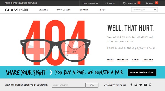 A Glasses também aproveita sua página de erro para estimular 2 conversões: compra no e-commerce e/ou inscrição de newsletter para desconto exclusivo.