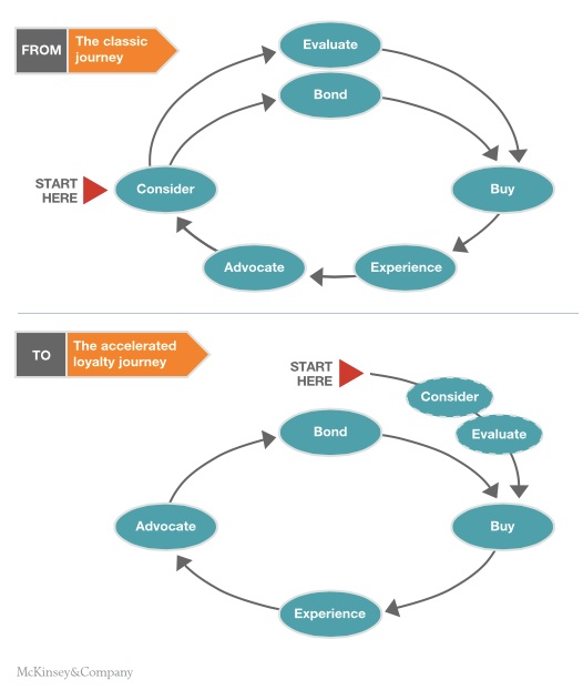 Ao longo dos últimos anos, muitas marcas trabalharam no resgate de seu papel na decisão dos consumidores, investindo em ferramentas tecnológicas e competências que as permitem recuperar relevância no processo. Elas perceberam que as empresas não podem mais apenas reagir aos consumidores, mas devem desenhar a jornada de compras dele e entregar valor por meio dela. As instituições que conseguem desenvolver esse trabalho de forma bem feita são capazes de reduzir a importância ou até suprimir as fases de consideração e avaliação, catapultando os consumidores para a fidelidade.